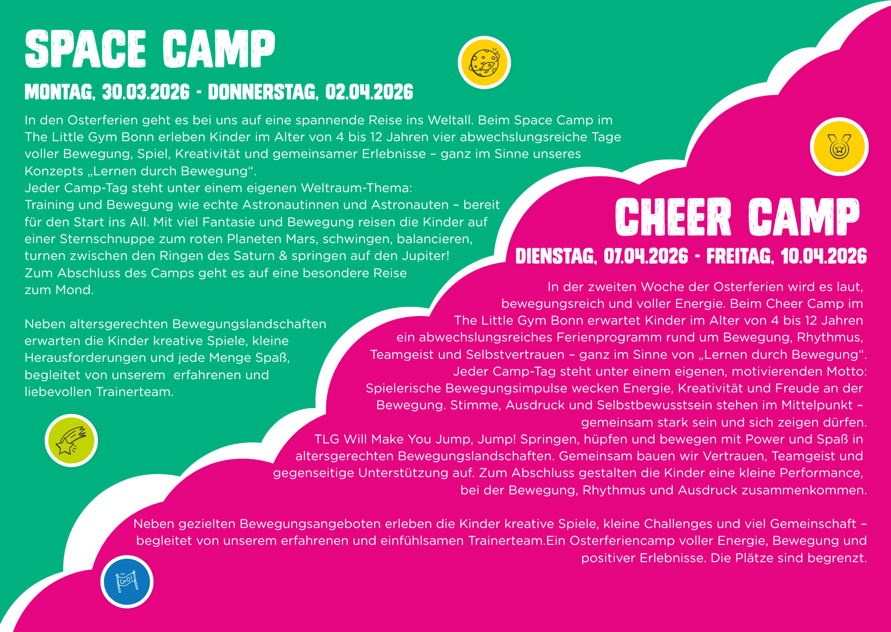 Die Camps finden während der Schulferien bei jedem Wetter statt und kombinieren Spaß, Sport, kreative Aktivitäten und Lernen, damit eure Kids auch zu dieser Zeit aktiv bleiben und unterhalten werden!